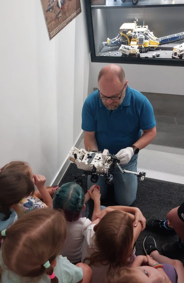 W Świecie Małych Techników w Krakowie regularnie obserwuję rodziców i dzieci budujących razem. Dziecko i rodzic siedzą obok siebie przy klockach. Początkowo to dziecko projektuje, a rodzic „pomaga”. Po chwili role zaczynają się mieszać, rodzic coś proponuje, dziecko negocjuje, razem kombinują. I nagle powstaje most, rakieta, samochód terenowy albo zupełnie nowy wynalazek, który nie ma jeszcze nazwy.